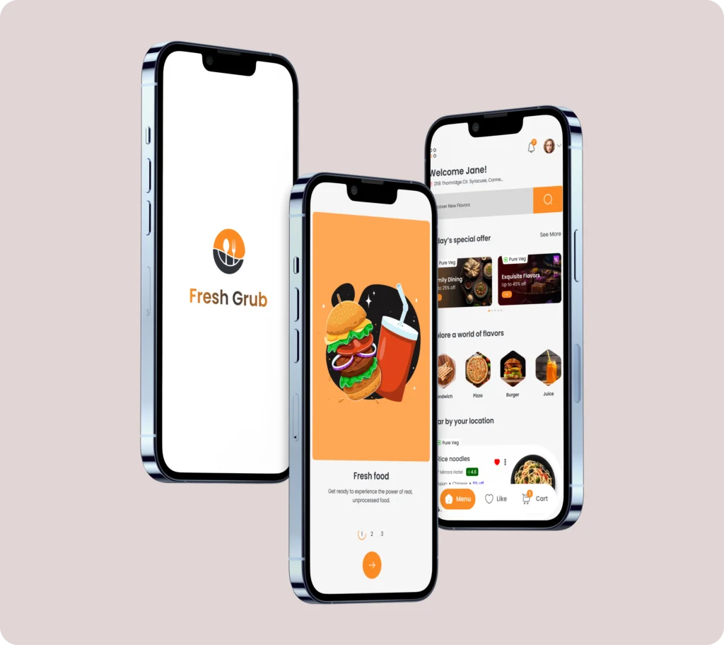 The UI/UX philosophy for Fresh-Grub is centered on “culinary convenience.” The interface was designed to be clean, intuitive, and visually engaging, minimizing taps and friction. We focused on creating a logical flow with powerful search filters, clear restaurant menus, and prominent calls-to-action, ensuring users can navigate, order, and pay with absolute ease and confidence.