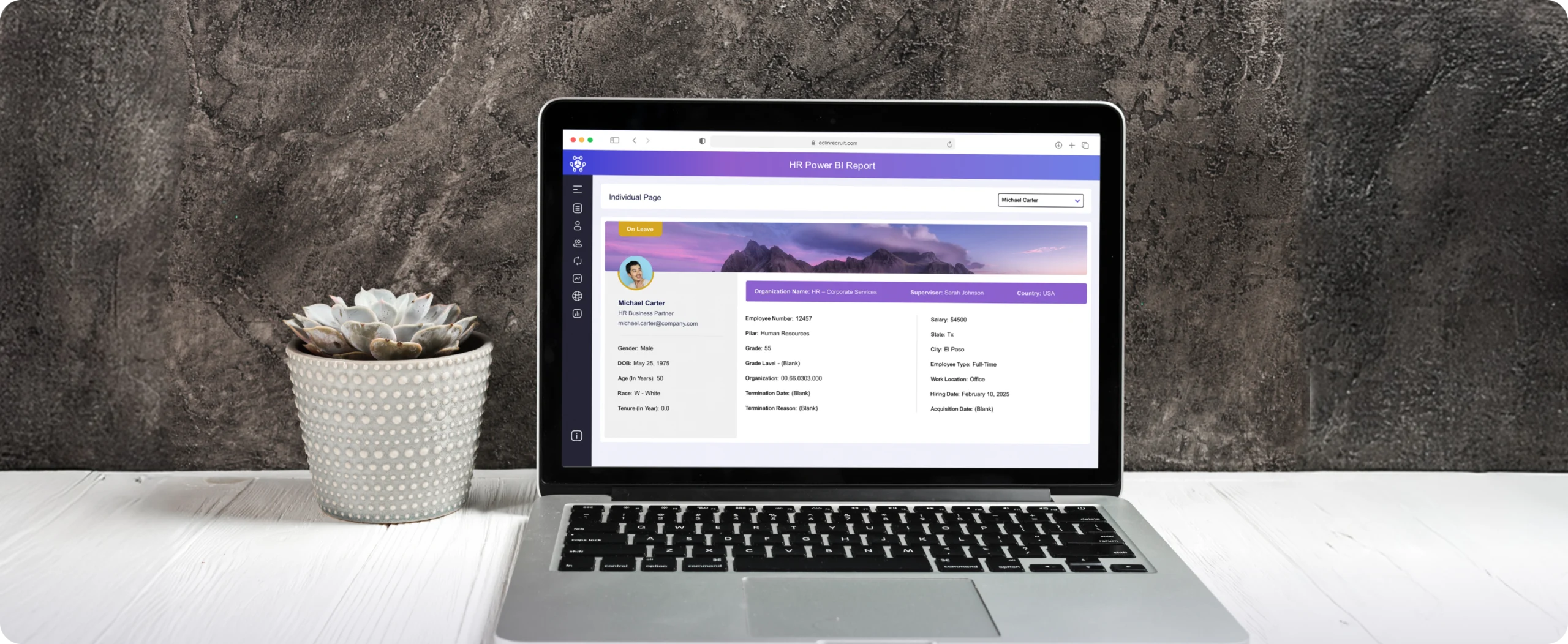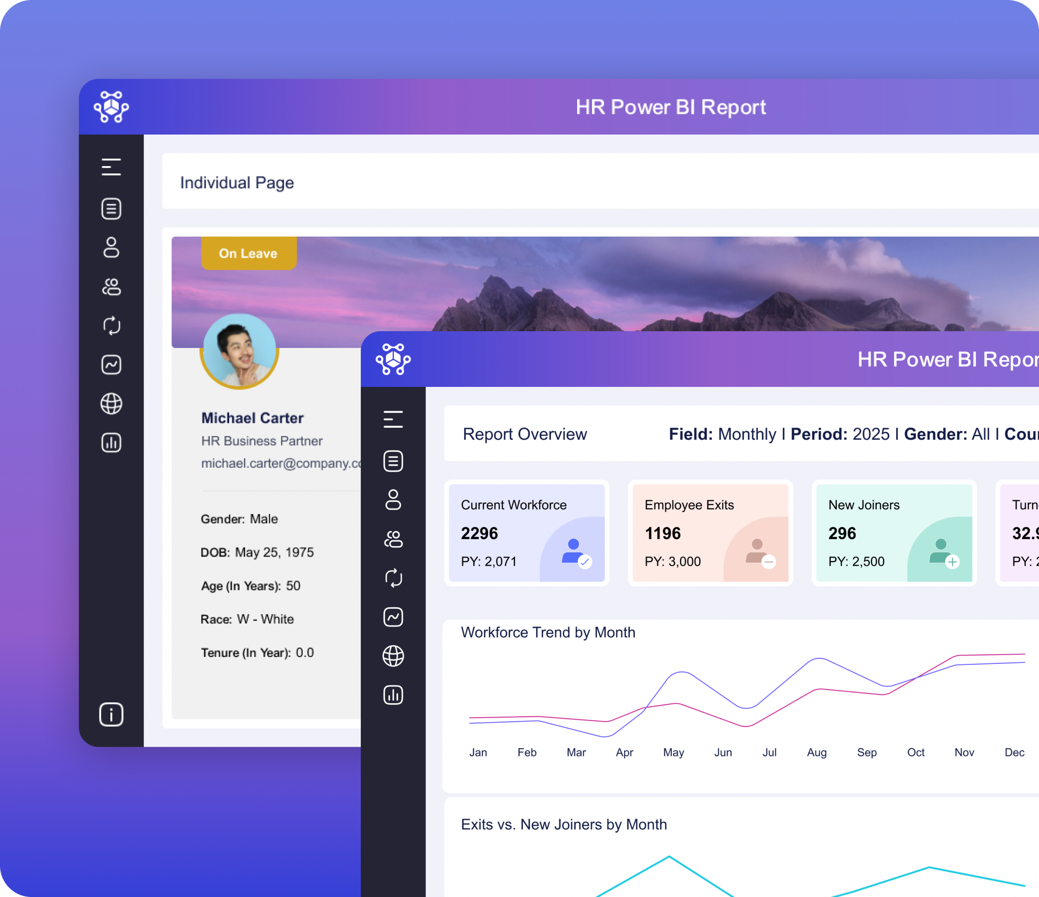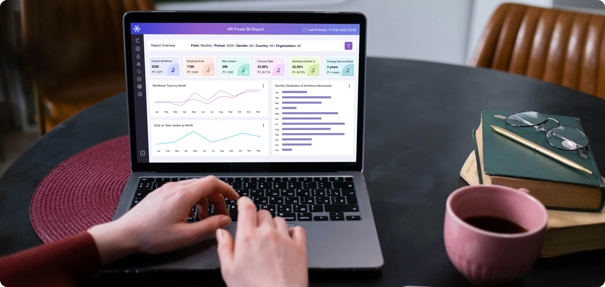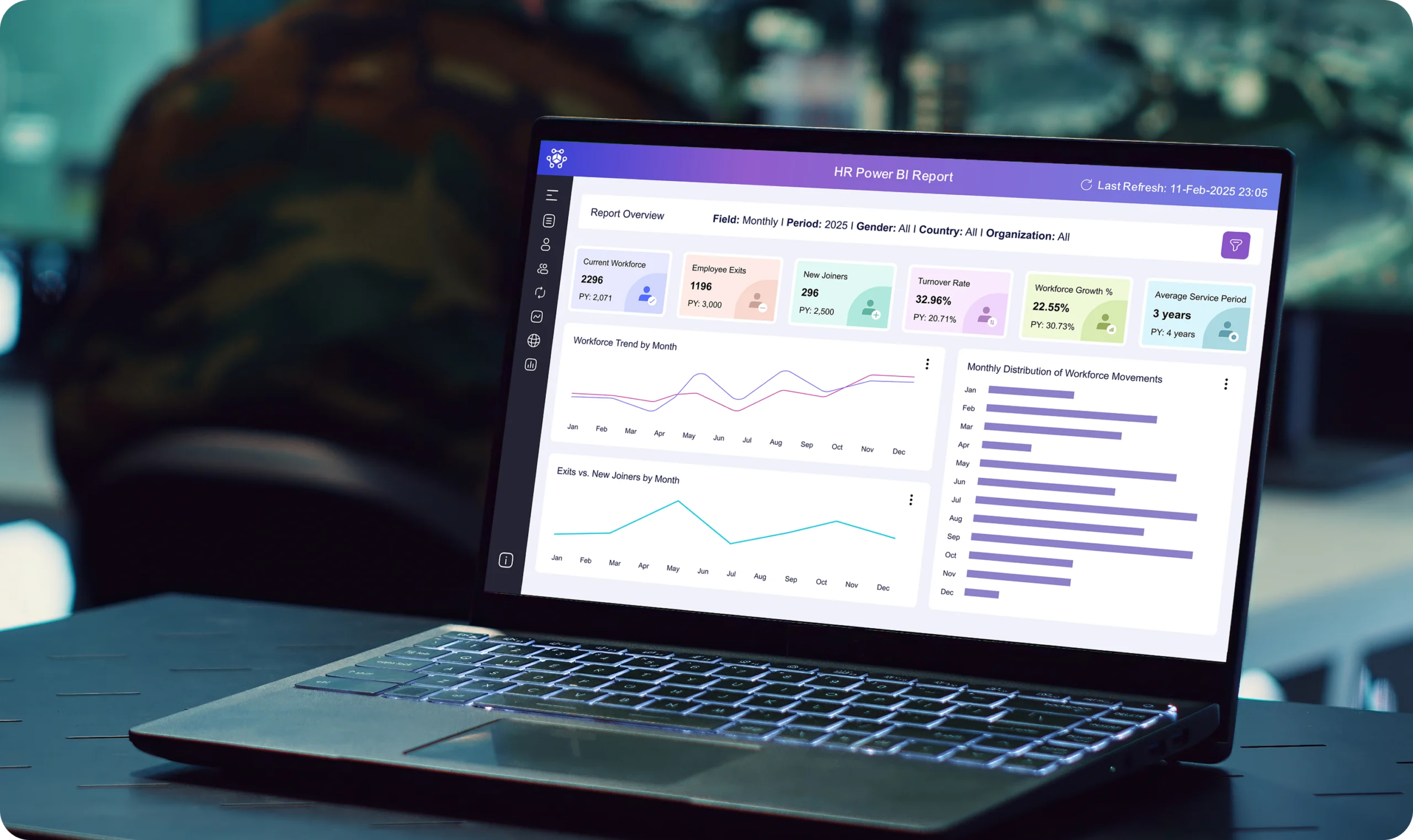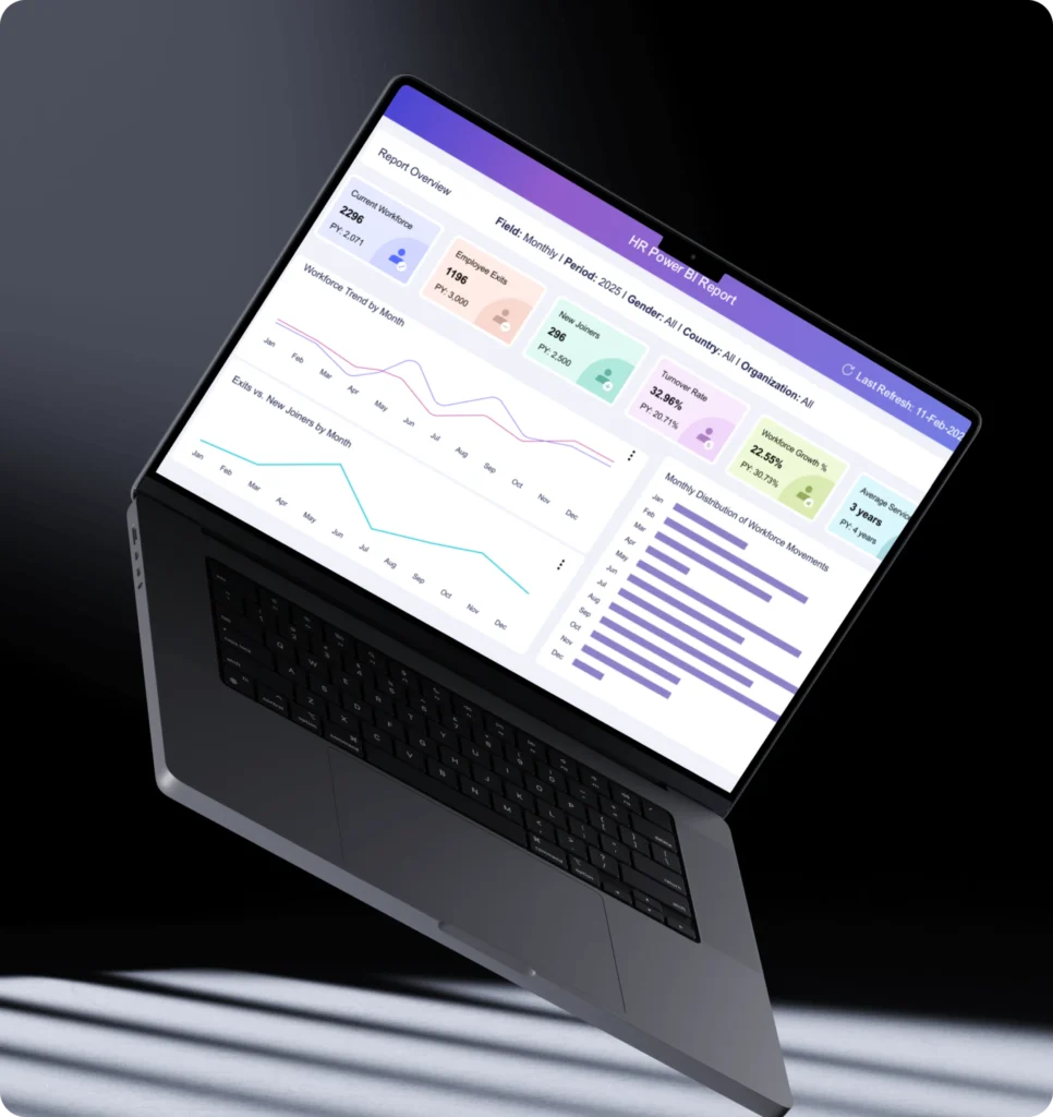 Our Power BI solution provides a robust HR data model with intelligent automation tailored to workforce management. The system centralizes disparate HR data into a secure warehouse, enabling deep analysis and real-time visualization.